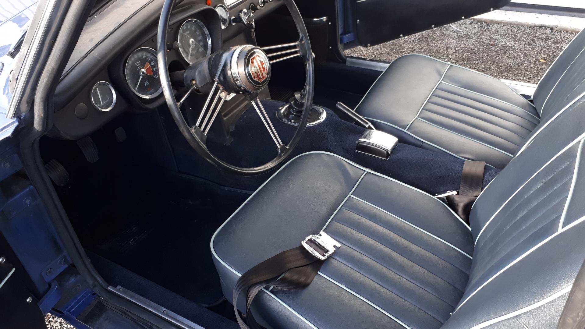 MGB GT d'origine Californienne saine, prête pour rouler, dans sa couleur d'origine Mineral blue, avec moteur refait, pneus, roues à rayons chromées neufs, échappement inox neuf, moquette et sellerie neuves, pavillon de ciel de toit neuf, crémaillère de direction, radiateur, durites d'eau, pompe à essence neufs... 4 places -